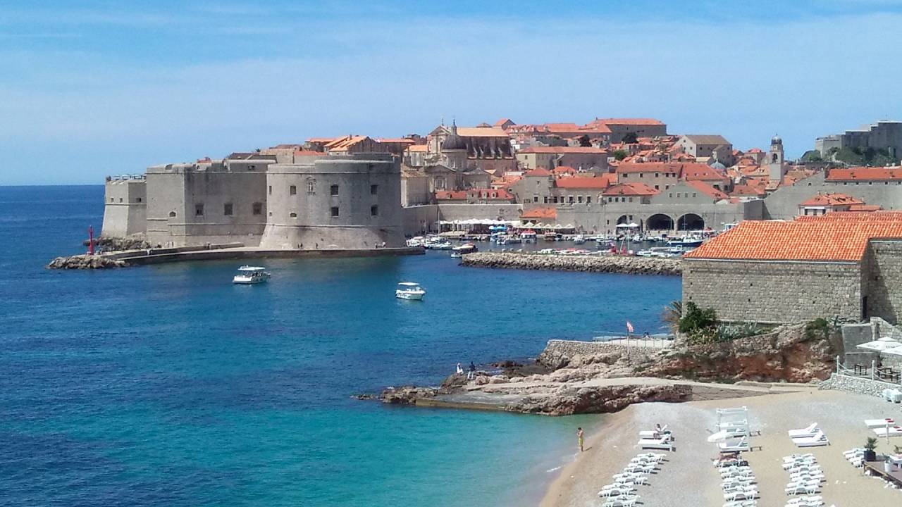 まずはメイン門の1つ・プローチェ門から旧市街を出て右へ( 海側に沿って) まっすぐ進むと旧市街を眺めながら泳げるバニエビーチに到着しま す。 階段を降りるとビーチですが階段を降りずに歩道沿いで写真を撮る とこんな感じです。