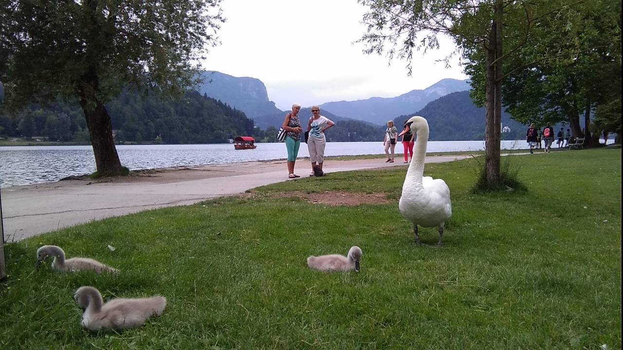 スロベニア・ブレッド湖ですが白鳥の一家です(お父さん?の姿が見えません。お仕事中でしょうか・・・)。↓